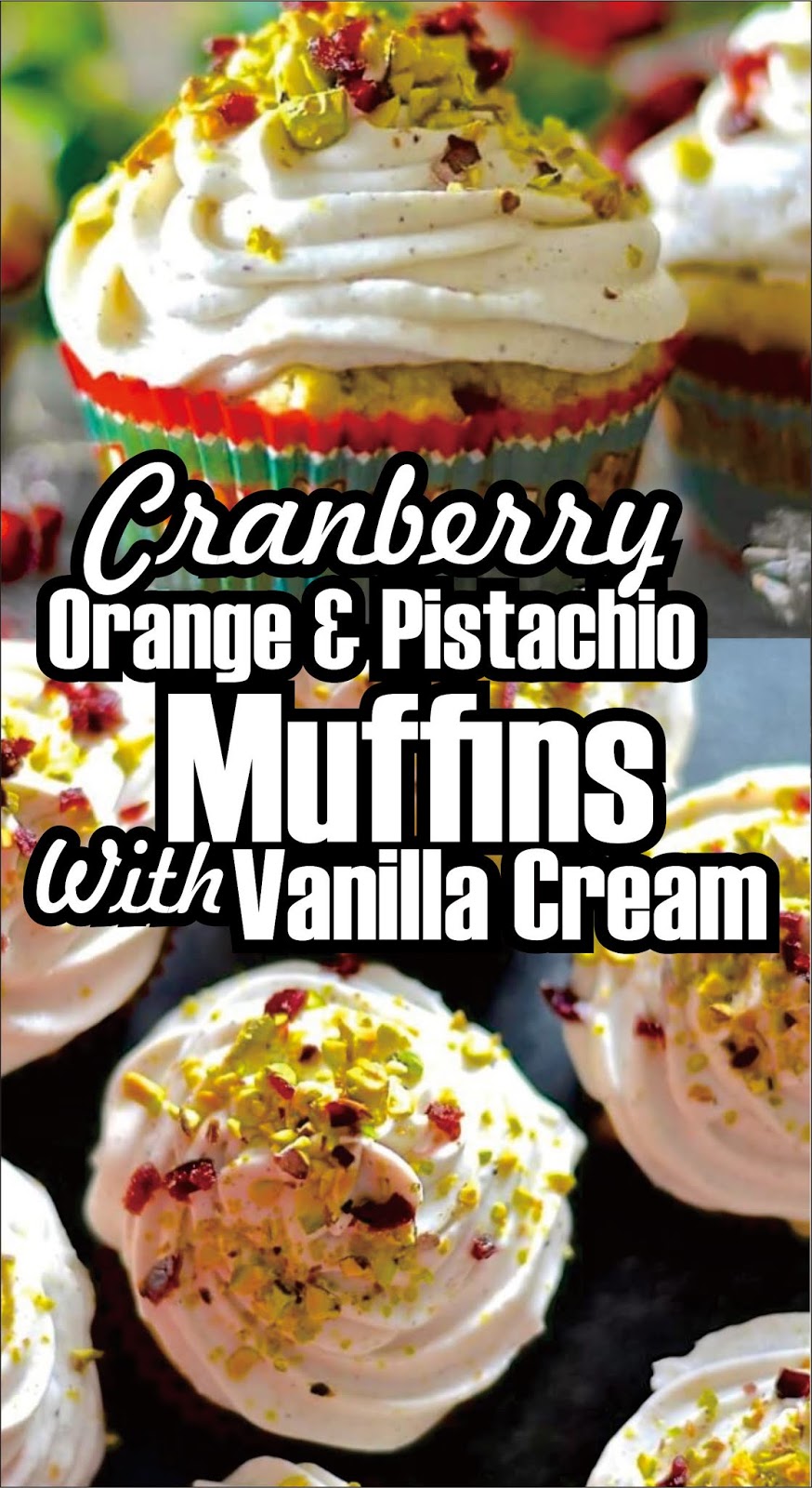 - Either pipe or spread onto the muffins then decorate with some chopped pistachios and dried cranberries.